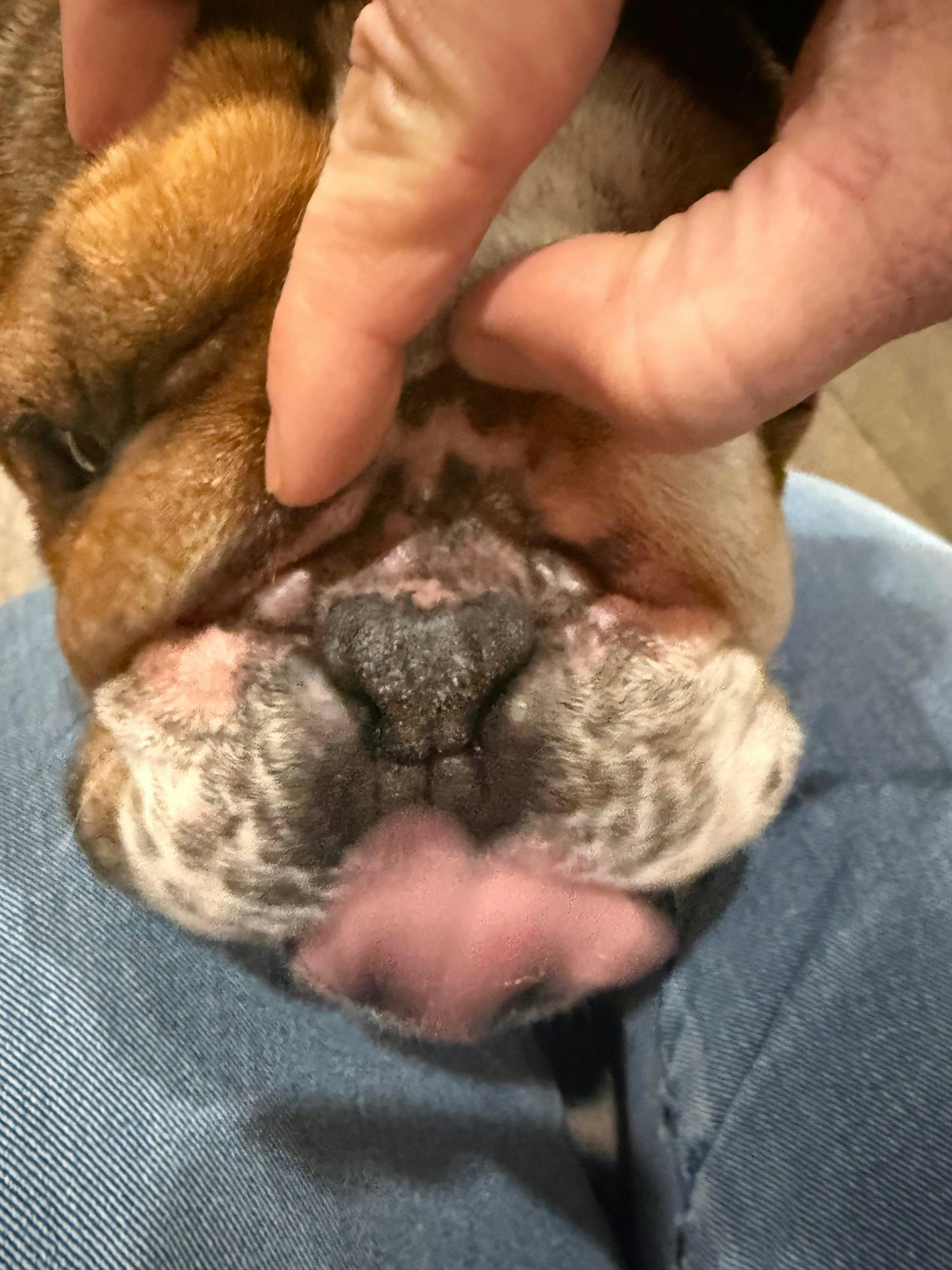• Skin Irritation or Allergies: Skin irritations can cause a dog to compulsively lick or bite themselves until the affected area becomes raw. This is especially true in the case of English Bulldogs and French Bulldogs, who generally have extra skin folds around their faces that are prone to becoming irritated. Additionally, some pups may develop allergies which can cause them to itch uncontrollably leading them to scratch or bite at the affected areas.