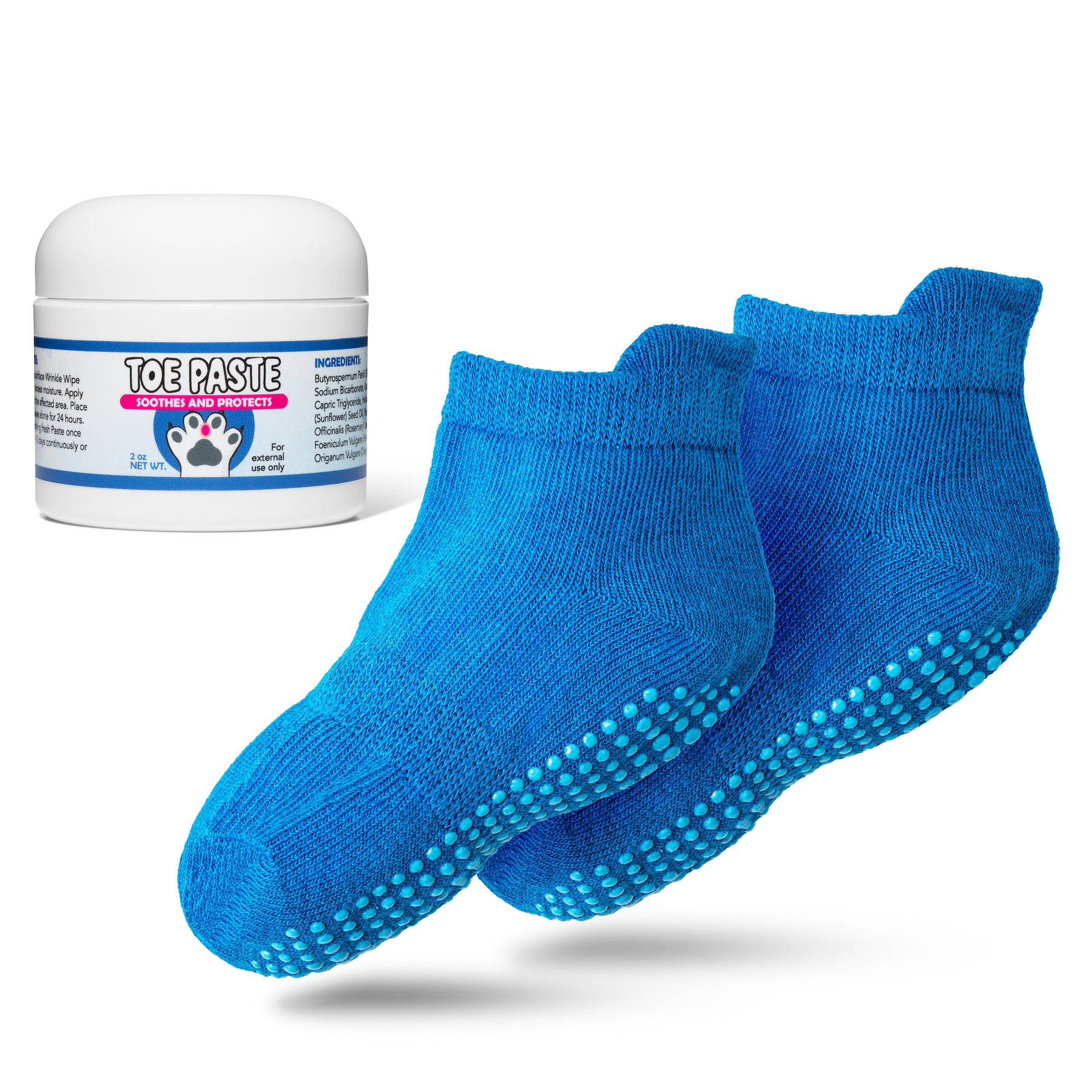 Blue socks with textured sole and a container labeled 'Toe Paste' on a white background